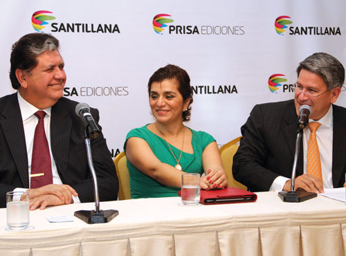 Mara Seminario durante la presentación de su libro País Multidestino. La flanquean el expresidente Alan García y el exministro de Comercio Exterior, Martín Pérez.