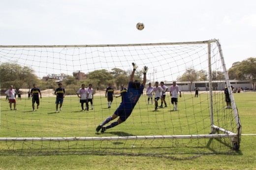 A las nubes. Penal errado por Jimmy Sánchez (Amigos UDEP) ante el portero Leo Guerrero (Ingeniería).