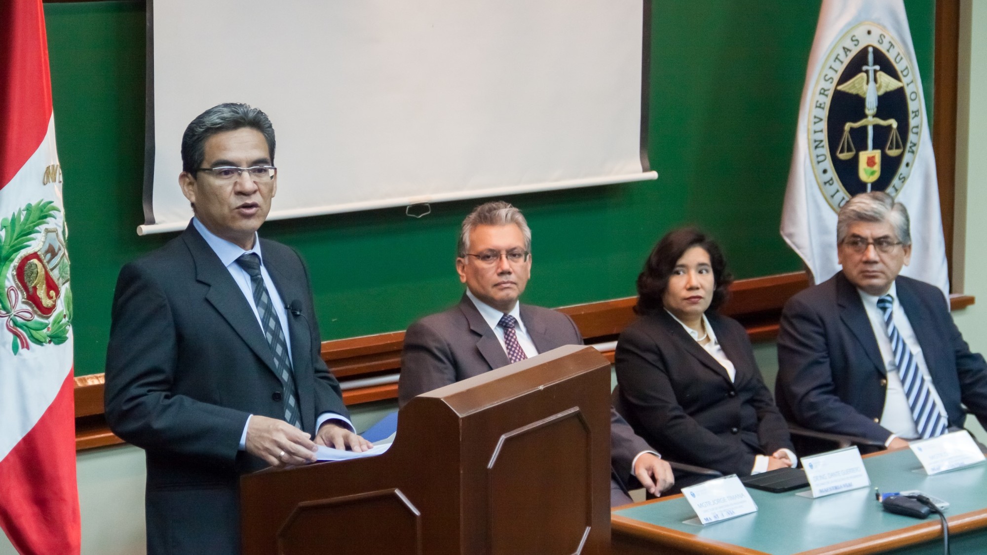“Lo que realmente nos mueve es el deseo de desarrollo de las regiones y del país”, afirmó el Ing. Jorge Timaná. En la mesa de honor, los doctores Dante Guerrero, Gaby Ruiz y Germán Gallardo.