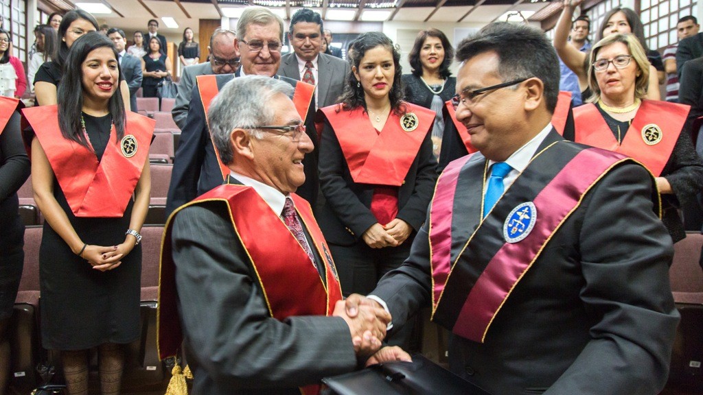 El rector de la UDEP, Sergio Balarezo Saldaña, impuso la insignia de la Universidad de Piura al magíster Gonzales López. “25 años es muy poco para una Facultad, pero tener profesores honorarios indica que hay un camino recto y bien seguido”, remarcó mientras le daba la bienvenida al claustro al Profesor Honorario.