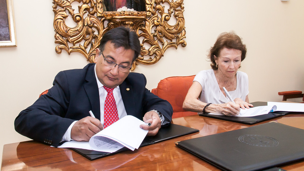 El rector, Dr. Sergio Balarezo, y la presidenta del Comité Directivo de la Alianza Francesa en Piura, Cecilia Elías, firman el convenio interinstitucional.