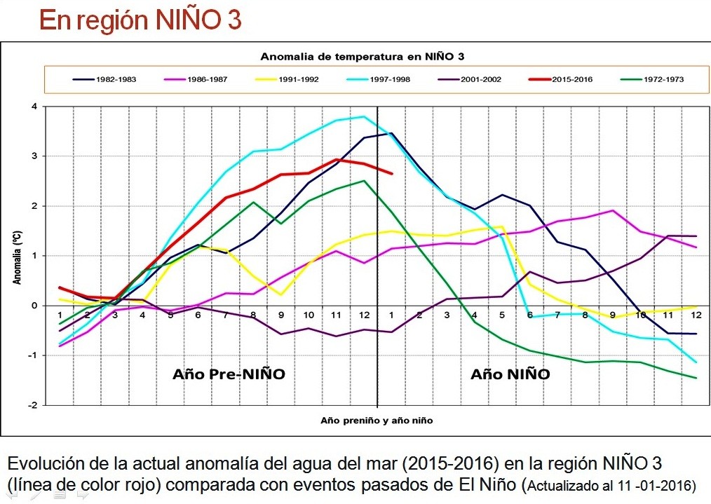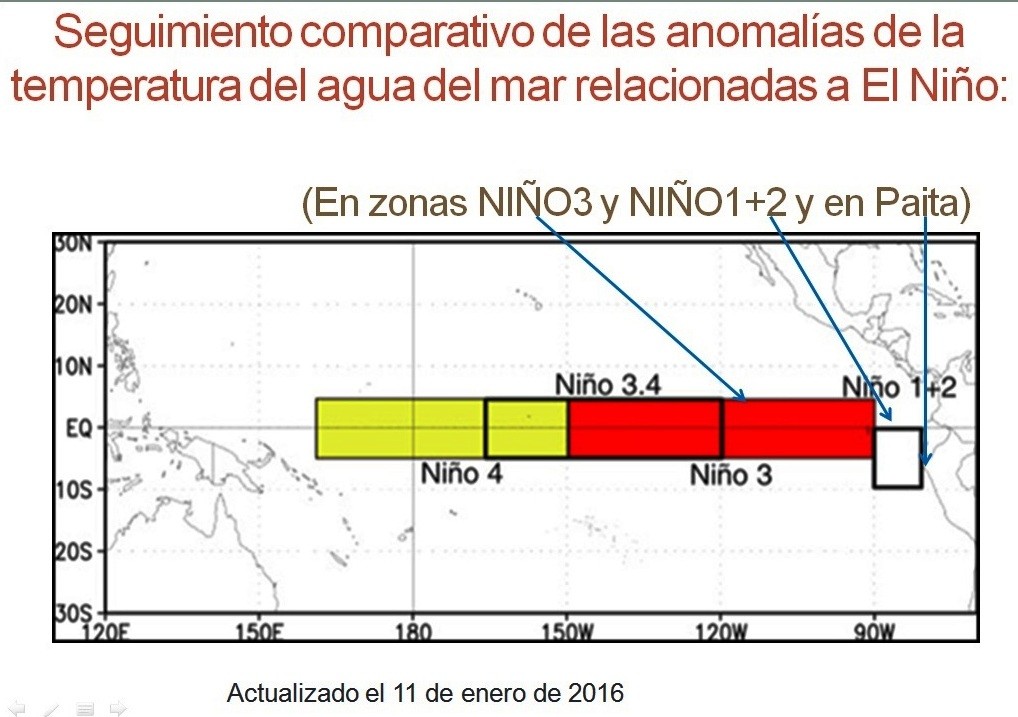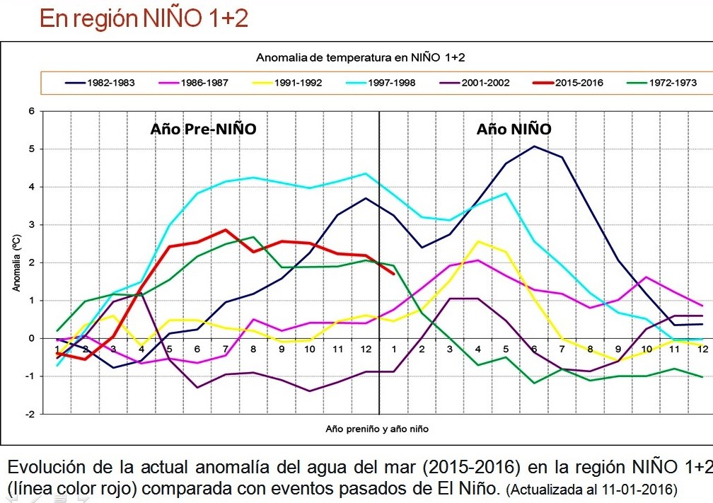 Por Elena Belletich Ruiz. 12 enero, 2016.En los gráficos del seguimiento del Fenómeno se muestra la evolución mensual de este parámetro, comparando con eventos de El Niño 82-83 y 97-98. En los primeros días de enero del 2016, se observa un apreciable descenso de la Temperatura Superficial del Mar ( TSM) en Paita.