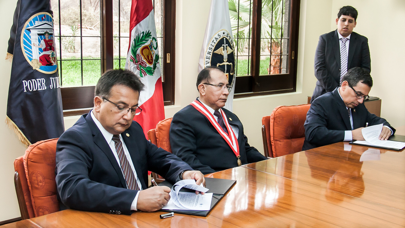 El documento fue suscrito por el rector de la UDEP, doctor Sergio Balarezo Saldaña, y el gerente general del Poder Judicial, Mg. Pedro Tapia Alvarado. Asistieron al acto el presidente de la institución, doctor Víctor Ticona; el expresidente del PJ, Enrique Mendoza; el secretario general de la Universidad, ingeniero William Zapata, y el director de estudios de la Facultad de Derecho, doctor Paolo Tejada.