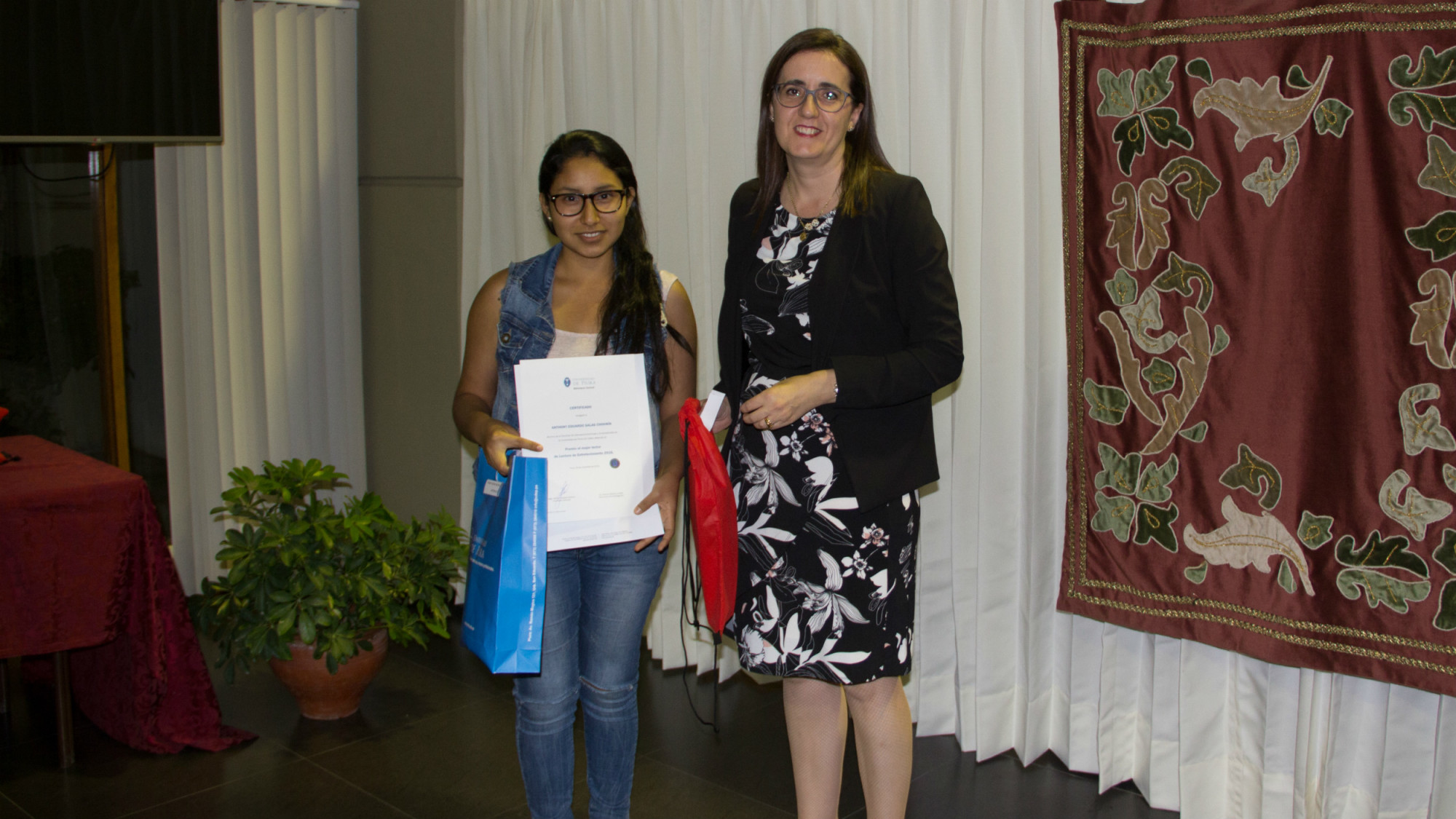 La hermana de Anthony Eduardo Salas Chininín recibe el premio de manos de la directora de la Biblioteca, María José Andrade.