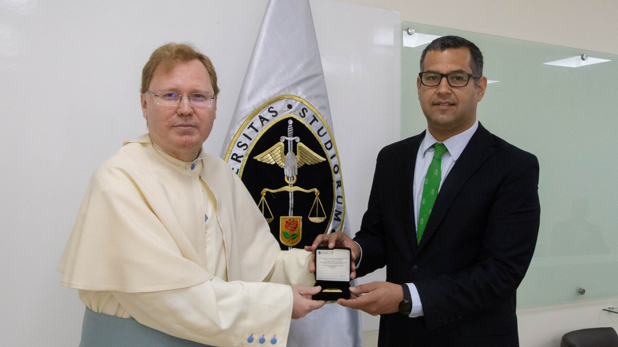 Al finalizar el conversatorio, decano de la Facultad de Derecho, doctor Ernesto Calderón, entregó al visitante la medalla conmemorativa por los 50 años de la UDEP, quien fue invitado a firmar el libro de visitantes ilustres.