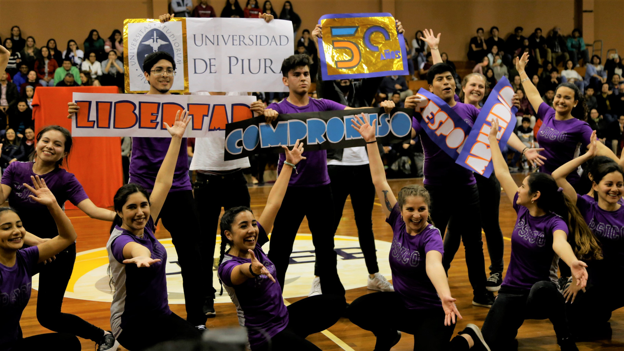 La fiesta deportiva comenzó con una competencia de drill, en la que cada programa académico presentó un número de baile que narraba amenamente la historia de la Universidad de Piura a través de sus cincuenta años de fundación.