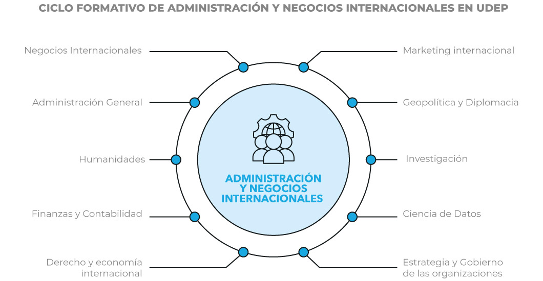 Innovación curricular con enfoque internacional. El programa potencia nuestra sólida malla de Administración de empresas y negocios internacionales con cursos clave relacionados con Geopolítica y Diplomacia, Interculturalidad y Estrategias de Internacionalización.