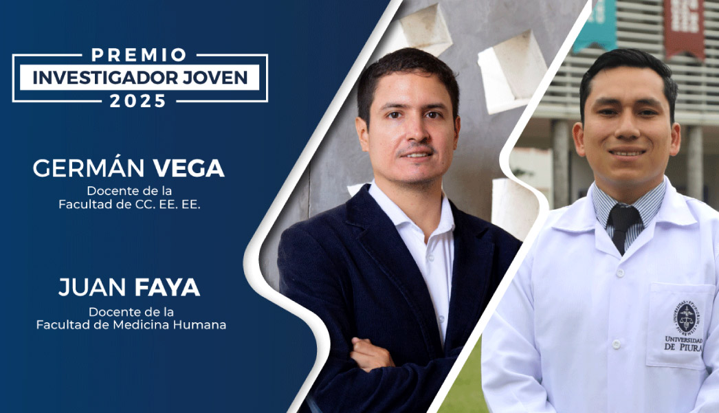 En la edición 2025, el Premio Investigador Joven ha otorgado el reconocimiento a dos profesores de la Universidad de Piura, menores de 35 años: Germán Vega (Ciencias Económicas y Empresariales) y Juan Faya (Medicina Humana), en mérito a su destacado esfuerzo y por su compromiso, desde temprana edad, a contribuir de manera rigurosa, con la investigación y su impacto en la sociedad.