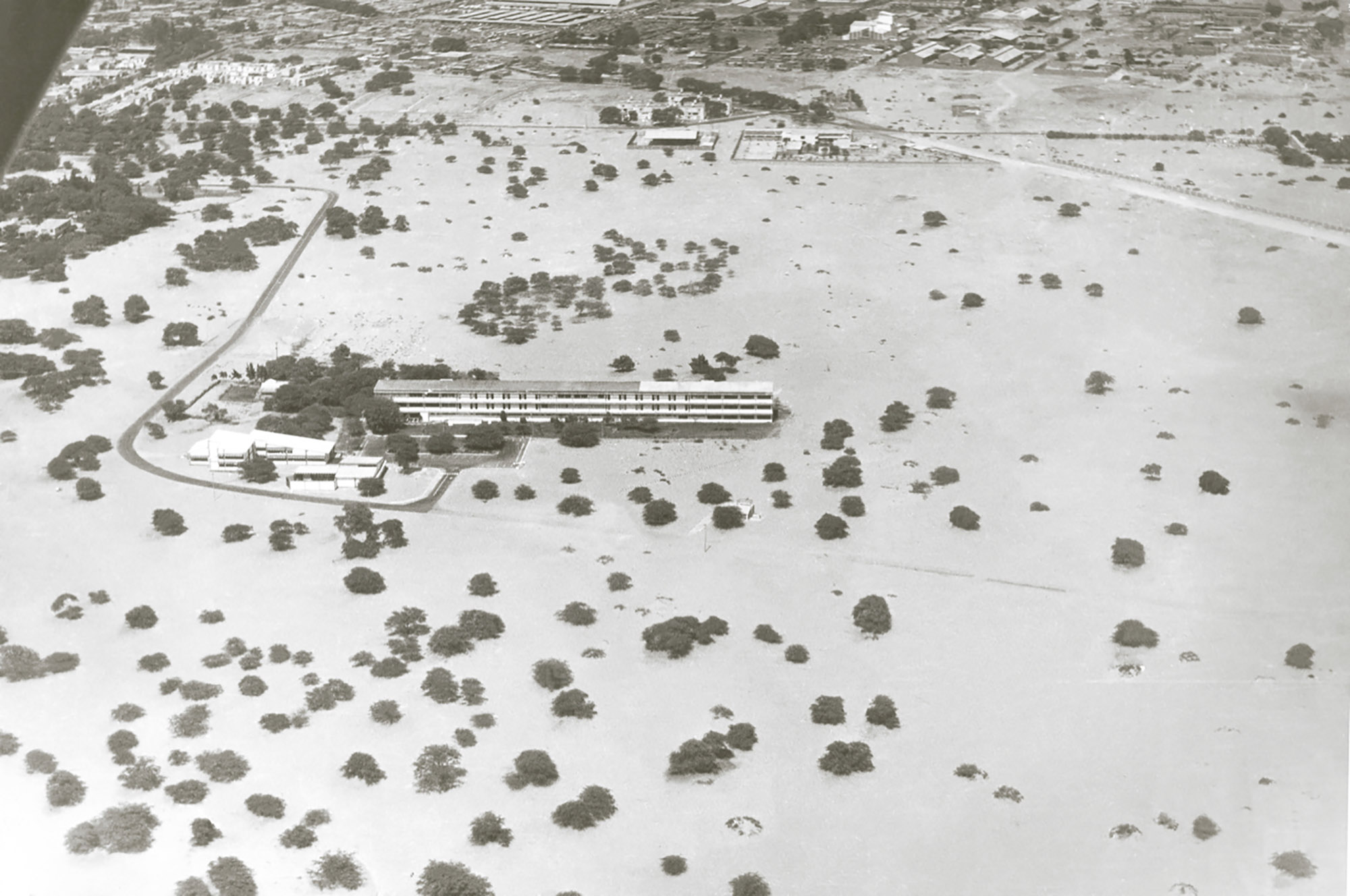 Fotografía aérea del campus hecha desde avioneta por un voluntario italiano en 1981. Se aprecia el Edificio Principal completo en sus tres fases, una playa de estacionamiento, la primera fase de los laboratorios de Ingeniería Mecánico-Eléctrica, el almacén (hoy zona del CPA), cafetería y la pista principal de ingreso.