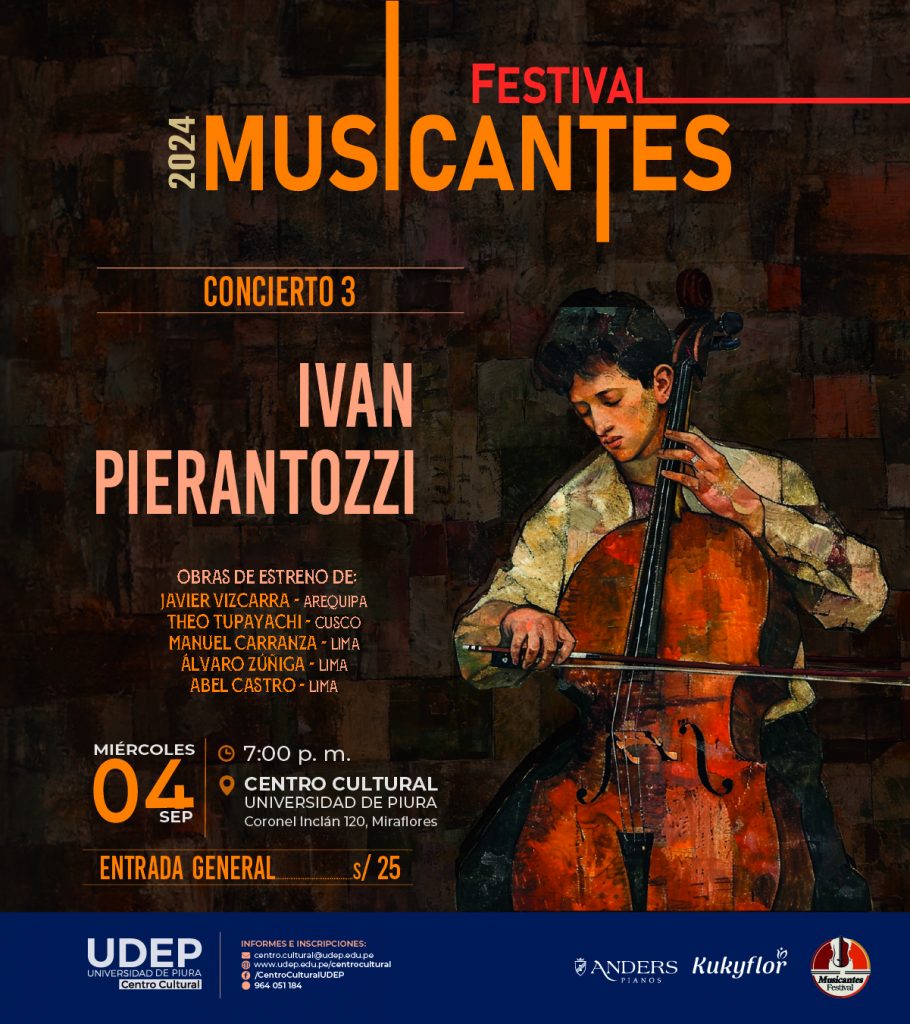 Iván Pierantozzi Fuchs, destacado violonchelista, se formó en “EL SISTEMA” de Venezuela desde 2004 con Inanlu Colmenares y María José Guédez. Perfeccionó su arte en la Academia Latinoamericana de Violoncello con William Molina Cestari. Desde 2010, fue miembro de la Orquesta Sinfónica Teresa Carreño de Venezuela, dirigida por Christian Vásquez. En 2016, ascendió a Principal de violoncello y en 2017, se unió a la Orquesta Sinfónica Simón Bolívar de Venezuela. Desde 2018 Pierantozzi se integró a Sinfonía por el Perú y en 2019, a la Orquesta Sinfónica Nacional del Perú. Fundó la extensión peruana de la Academia Latinoamericana de Violoncello. Destaca en la música de cámara con el Cuarteto ICPNA y Ensamble Artifex. Es miembro fundador de Harmons Music Hub.