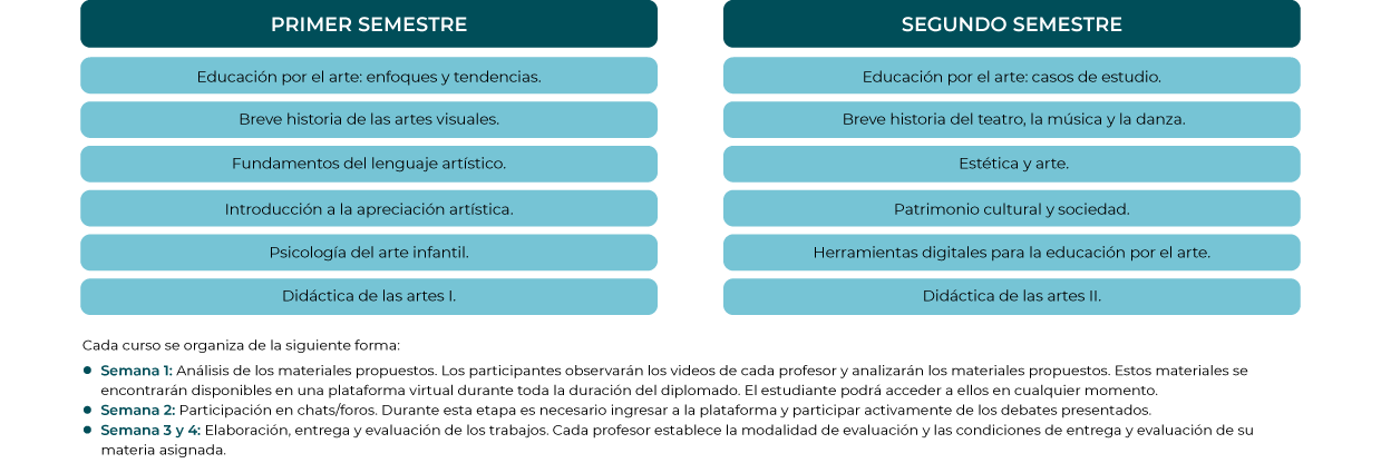 Dirigido a estudiosos de todos los campos de estudios – en especial los que hayan seguido un pregrado o postgrado, docentes escolares o universitarios – o aquellos que quieren completar sus estudios sobre las artes y de su alto valor educativo, este programa se ofrece de manera 100% online mediante clases asincrónicas permitiendo una alta flexibilidad horaria en el estudio de las materias.