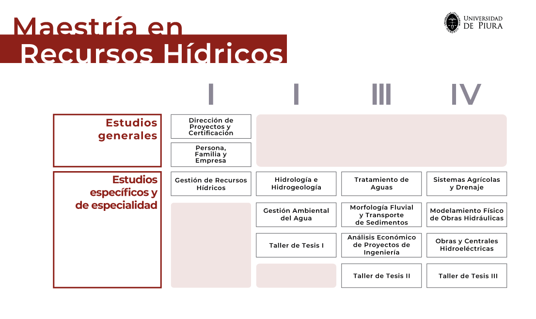 La Universidad de Piura ofrece desde el año 2007 la Maestría en Recursos Hídricos con el objetivo de brindar a los egresados en ingeniería civil, ingeniería agrícola y carreras afines; una elevada especialización en el diseño y operación de estructuras hidráulicas, modelación física y numérica, drenaje pluvial de ciudades, gestión y planificación de los recursos hídricos.