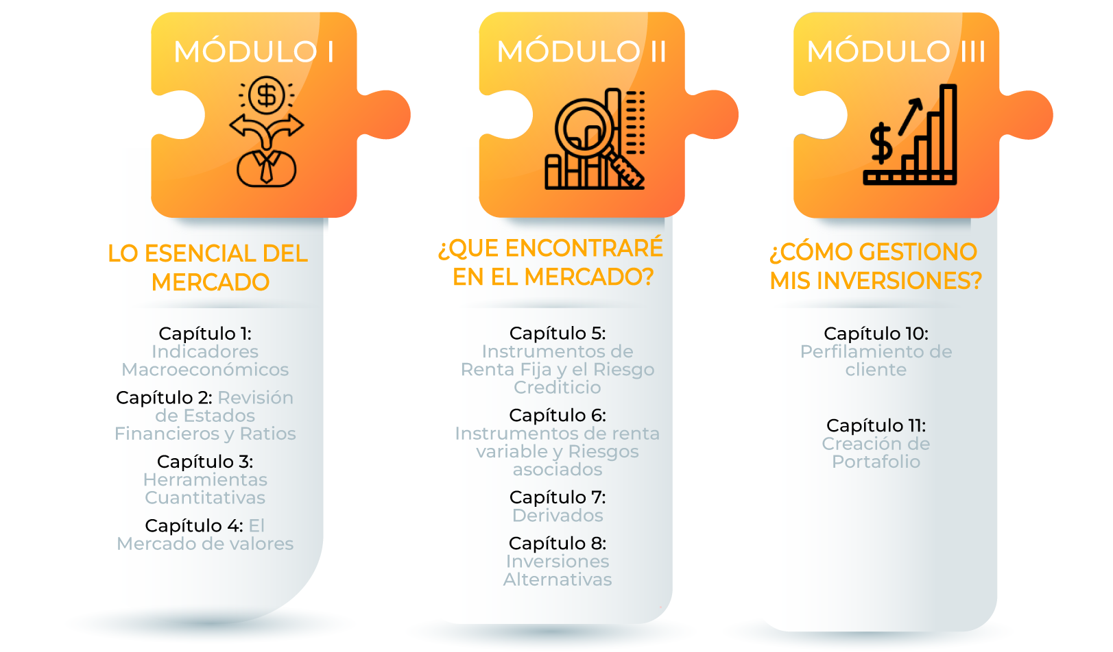 A lo largo del programa, aprenderás a interpretar los mercados financieros, identificar oportunidades, evaluar riesgos y seleccionar los instrumentos de inversión más adecuados según tus objetivos. El enfoque es teórico-práctico, claro y orientado a situaciones reales, lo que facilita aplicar los conocimientos en tu vida financiera desde el primer módulo.