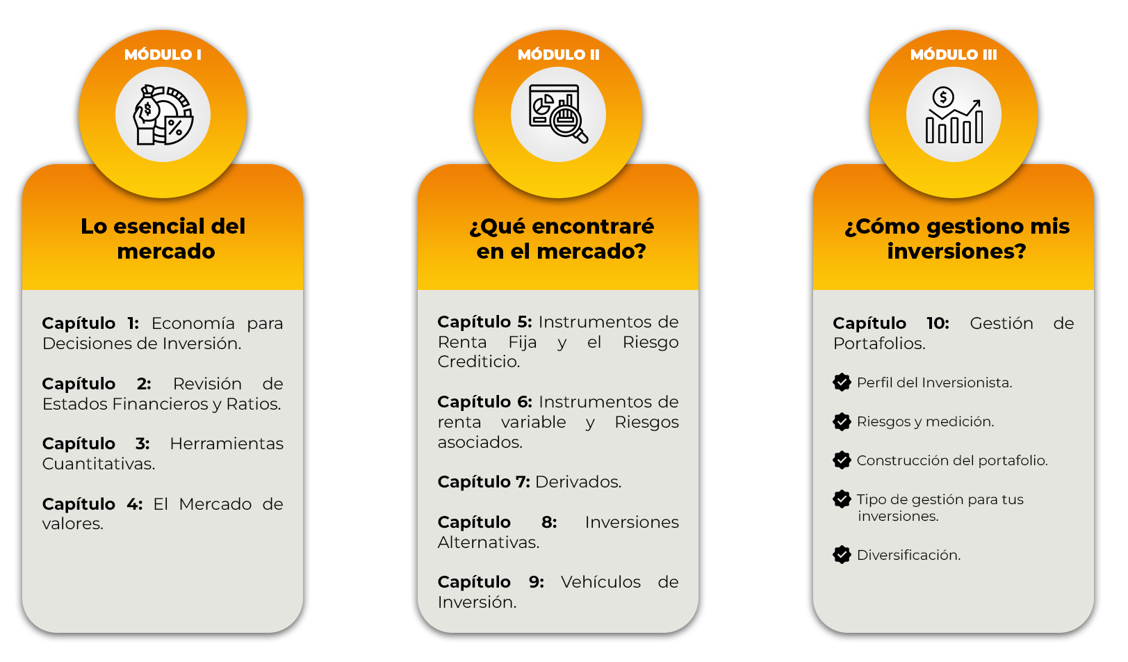 A lo largo del programa, aprenderás a interpretar los mercados financieros, identificar oportunidades, evaluar riesgos y seleccionar los instrumentos de inversión más adecuados según tus objetivos. El enfoque es teórico-práctico, claro y orientado a situaciones reales, lo que facilita aplicar los conocimientos en tu vida financiera desde el primer módulo.