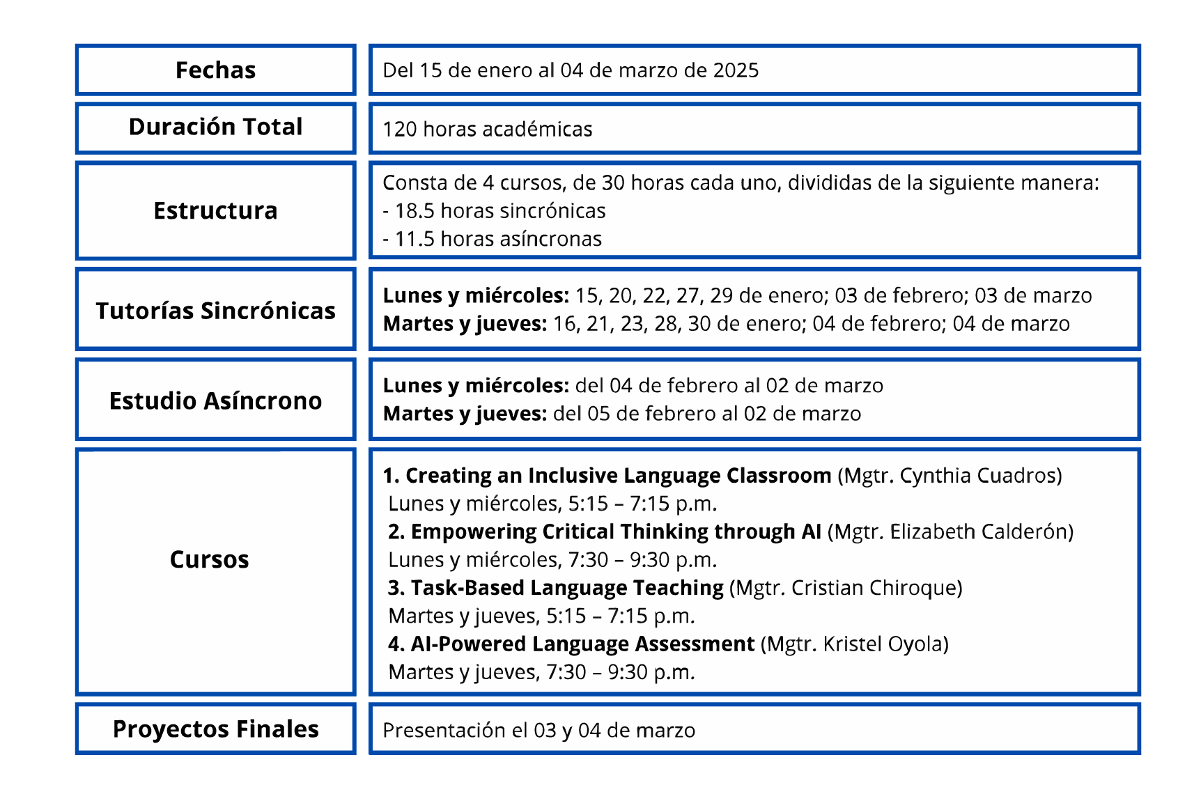 Docentes de colegios e instituciones educativas públicas o privadas con un nivel B1+ de inglés, interesados en optimizar sus estrategias pedagógicas dentro del contexto de la enseñanza-aprendizaje del inglés en entornos virtuales.
