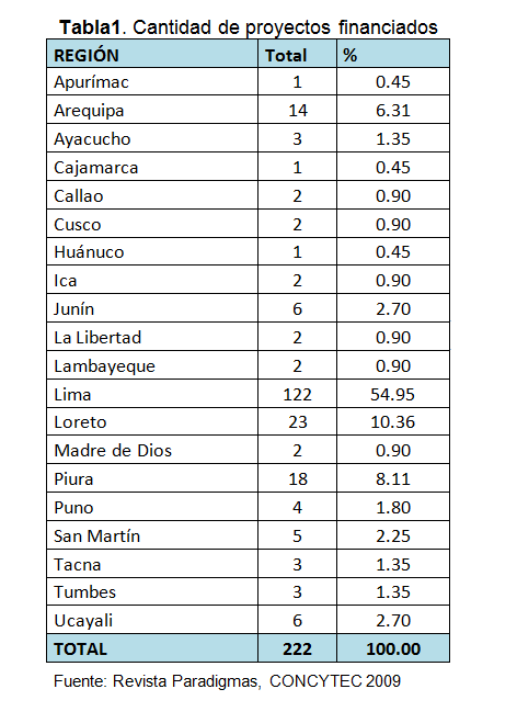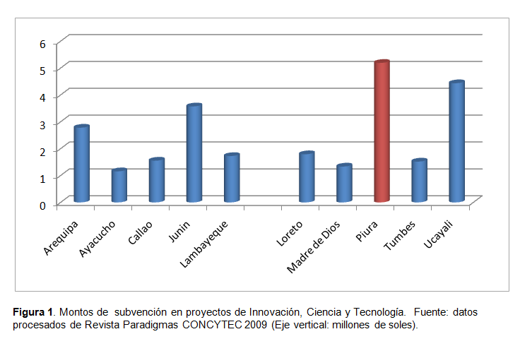Los fondos de los proyectos de la tabla 1 y Figura 1 provienen de los concursos de CONCYTEC (PROCYT, PROCOM, PROTEC), del FINCYT: Programa de Ciencia y Tecnología; y del Instituto de Ciencia, Tecnología e Innovación del Gobierno Regional Piura.