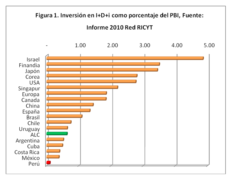 La tendencia internacional es incrementar la inversión en I+D. En nuestro país también han habido recursos que el estado ha orientado en I+D para poder revertir la situación, tal como se ilustra en la Figura 1 Perú destina el 0.1% de su PBI no obstante aún están por debajo de la media a nivel latinoamericano (0.63% del PIB). Los países desarrollados están por encima del 1%, siendo Israel el que lidera este indicador. A nivel latinoamericano Brasil y Chile tienen los más altos porcentajes de inversión en I+D; Brasil se ha planteado incrementar a 1.5% su inversión que significaría subir en un 50% los recursos actuales. Chile en el periodo 2006-2010 ha triplicado la inversión en I&D, pese a la crisis económica global, Orlando Jiménez ex jefe de Innovación del Ministerio de Economía, cartera encargada de profundizar la I+D declaró: “Lo importante es que los recursos públicos destinados a Ciencia, Tecnología e Innovación no cayeron; muy por el contrario, el presupuesto para el año 2010 experimentó un alza real de 19%, lo que es inédito en un escenario de crisis”.