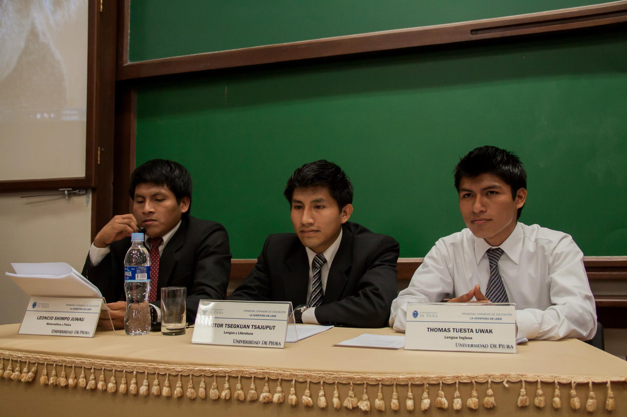 Leoncio Shimpo Juwau, Hector Tsegkuan Tsajuput y Thomas Tuesta Uwak, estudiantes de la Facultad de Ciencias de la Educación de la Universidad de Piura y provenientes de las comunidades nativas Huambisa y Awajún, participaron como ponentes en la mesa redonda “Leer en tres lenguas” desarrollada durante las Primeras Jornadas de Educación: La aventura de leer, que la Facultad organizó en el marco de su semana de aniversario.