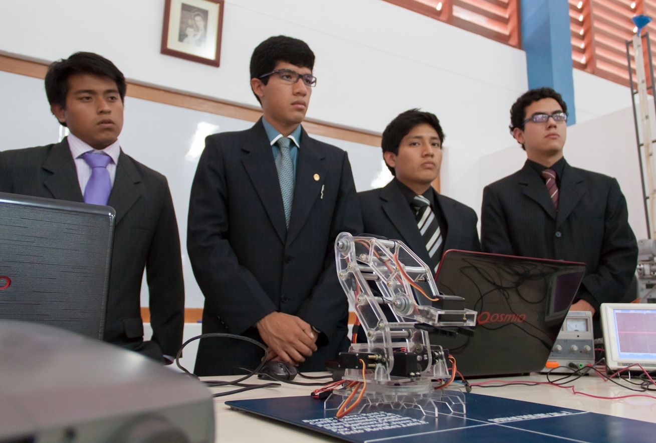 Fueron seis grupos, conformados por alumnos del séptimo y octavo ciclo, los que expusieron sus proyectos finales en el laboratorio de electrónica. “El brazo robótico se controla mediante una computadora, se ingresan las coordenadas y luego se envía la orden al dispositivo”, explica Darwin Salazar, alumno del curso. Asimismo, sostiene que a gran escala este brazo se puede utilizar, por ejemplo, en empresas que fabrican automóviles, para tareas específicas como: soldar, pintar, ajustar, taladrar, etc.