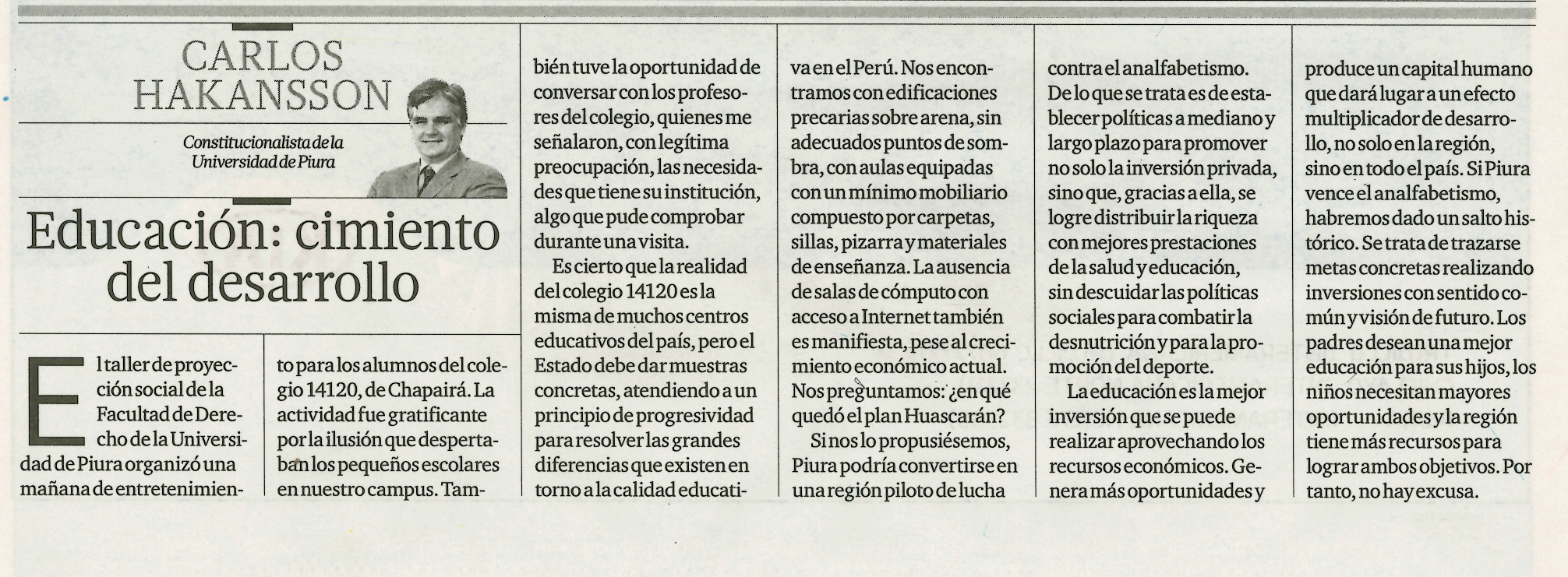 Por Carlos Hakansson. 14 enero, 2013.El pasado viernes, el taller de proyección social de la Facultad de Derecho de la Universidad de Piura, denominado “universitarios para el mundo”, organizó una mañana de entretenimiento para los alumnos del colegio 14120 de Chapairá. La actividad fue muy gratificante, por la ilusión que despertaban los pequeños escolares en las instalaciones del campus universitario. También tuve la oportunidad de conversar con los profesores del colegio quienes me trasmitieron, con legítima preocupación, las necesidades materiales que tiene su institución educativa, algo que pude comprobar durante una visita que realicé junto con mis alumnos.