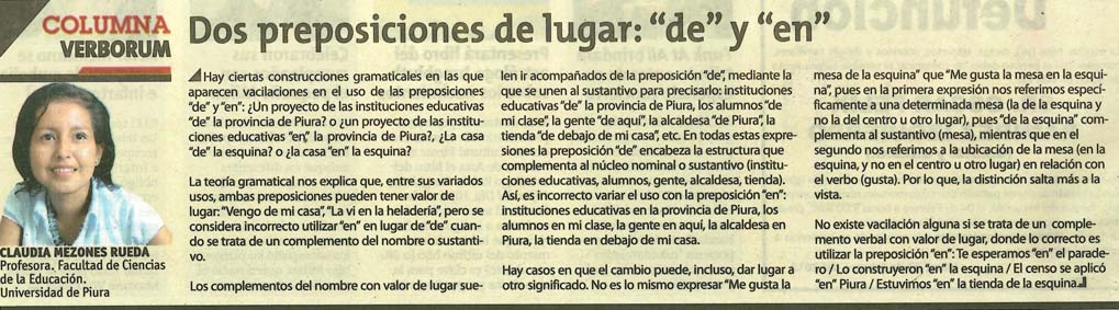 Por Claudia Mezones. 05 febrero, 2013.Hay ciertas construcciones gramaticales en las que aparecen vacilaciones en el uso de las preposiciones “de” y “en”: ¿Un proyecto de las instituciones educativas “de” la provincia de Piura? o ¿un proyecto de las instituciones educativas “en” la provincia de Piura?, ¿La casa “de” la esquina? o ¿la casa “en” la esquina?