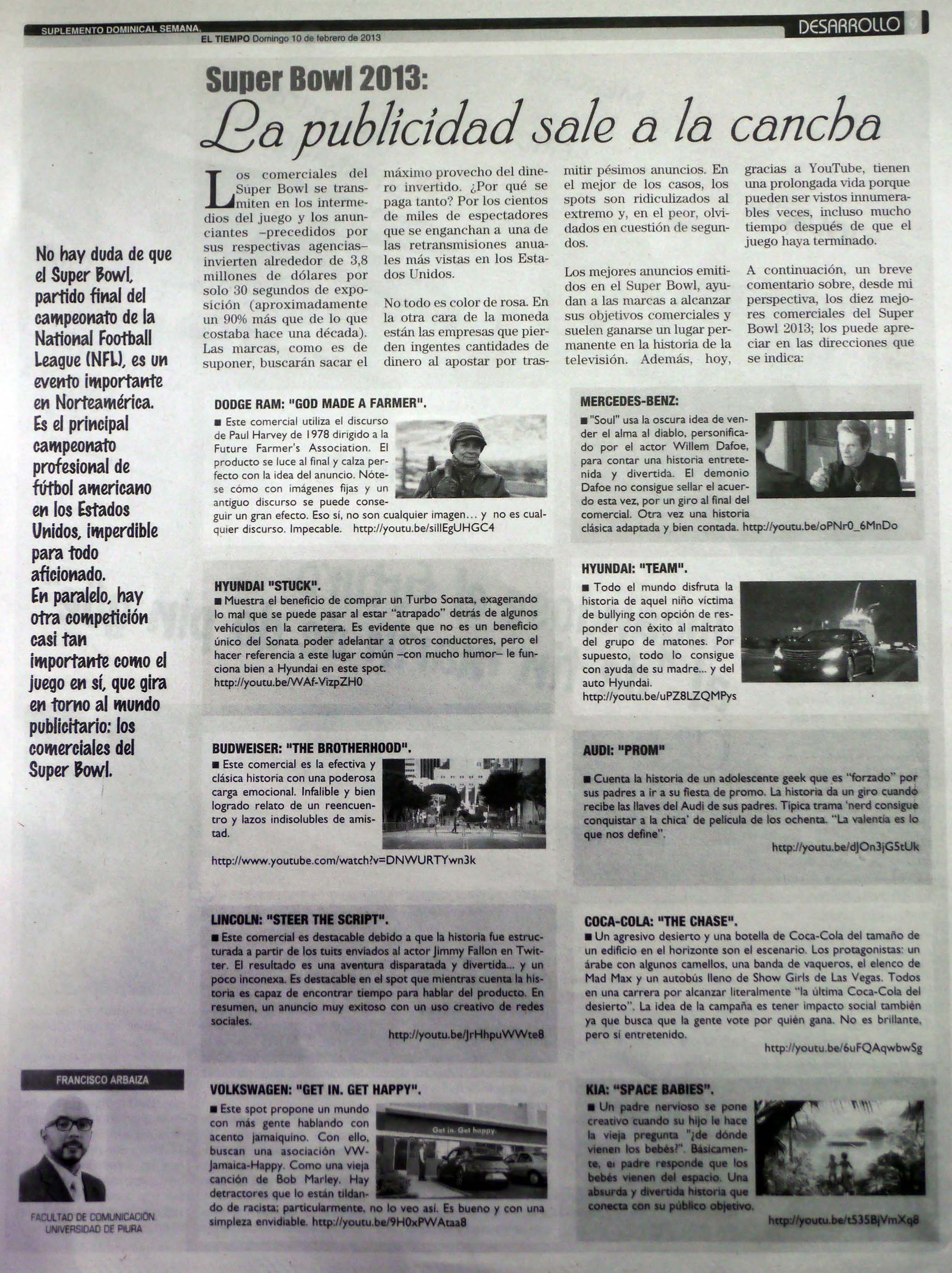 superbowl_1No hay duda de que el Super Bowl, partido final del campeonato de la National Football League (NFL), es un evento importante en Norteamérica. Es el principal campeonato profesional de fútbol americano en los Estados Unidos, imperdible para todo aficionado. En paralelo, hay otra competición casi tan importante como el juego en sí y que gira en torno al mundo publicitario: los comerciales del Super Bowl.