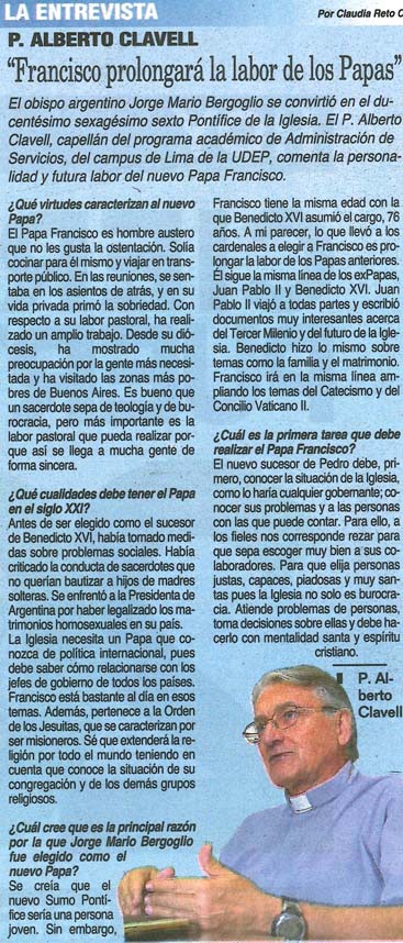 Por Claudia Reto. 13 marzo, 2013.El obispo argentino Jorge Mario Bergoglio se convirtió en el ducentésimo sexagésimo sexto Pontífice de la Iglesia. El P. Alberto Clavell, capellán del Programa académico de Administración de Servicios comenta la personalidad y futura labor del nuevo papa: Francisco.