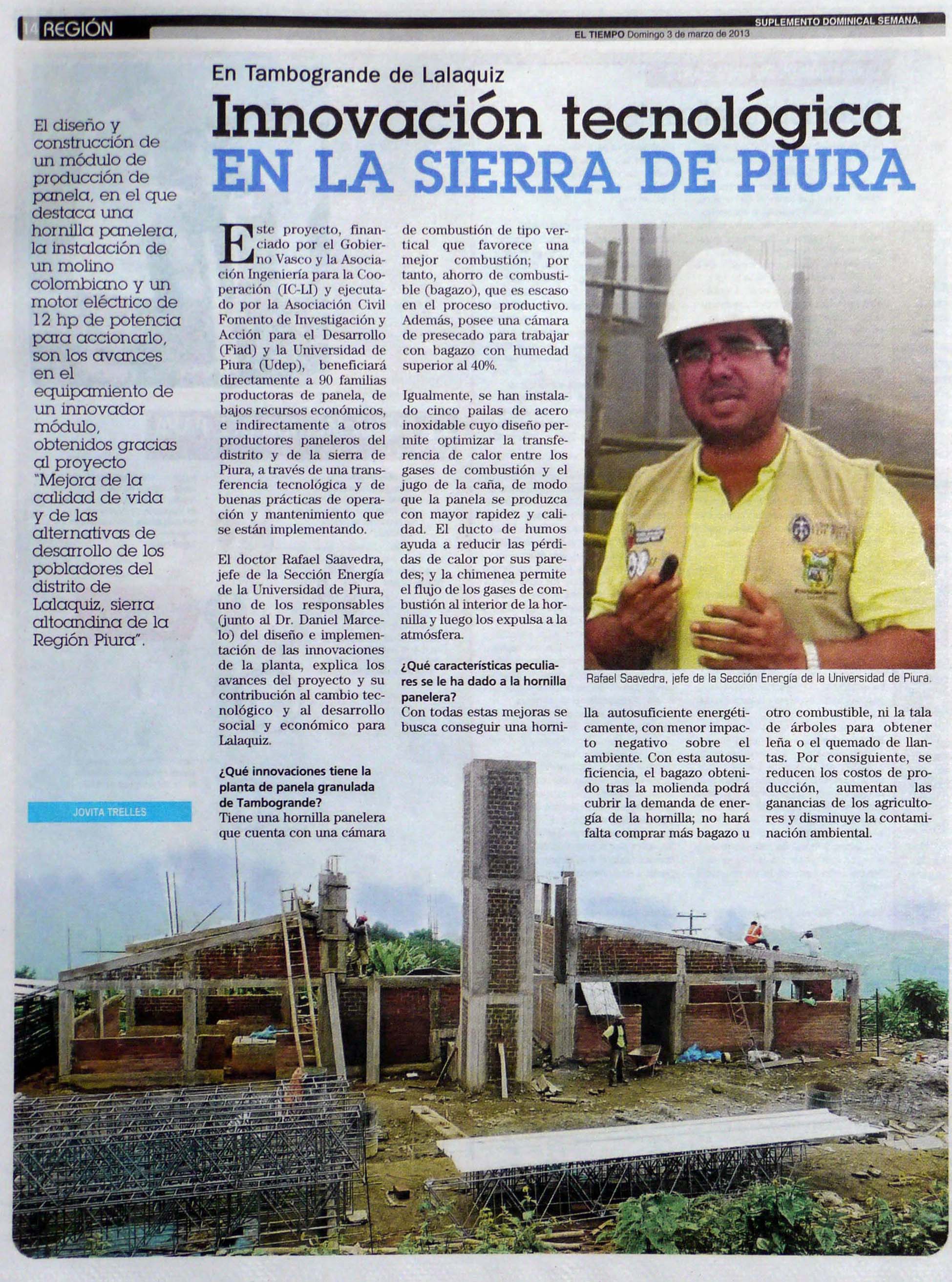Este proyecto, financiado por el Gobierno Vasco y la Asociación Ingeniería para la Cooperación (IC-LI) y ejecutado por la Asociación Civil Fomento de Investigación y Acción para el Desarrollo (FIAD) y la Universidad de Piura (UDEP), beneficiará directamente a 90 familias productoras de panela, de bajos recursos económicos, e indirectamente a otros productores paneleros del distrito y de la sierra de Piura, a través de una transferencia tecnológica y de buenas prácticas de operación y mantenimiento que se están implementando.