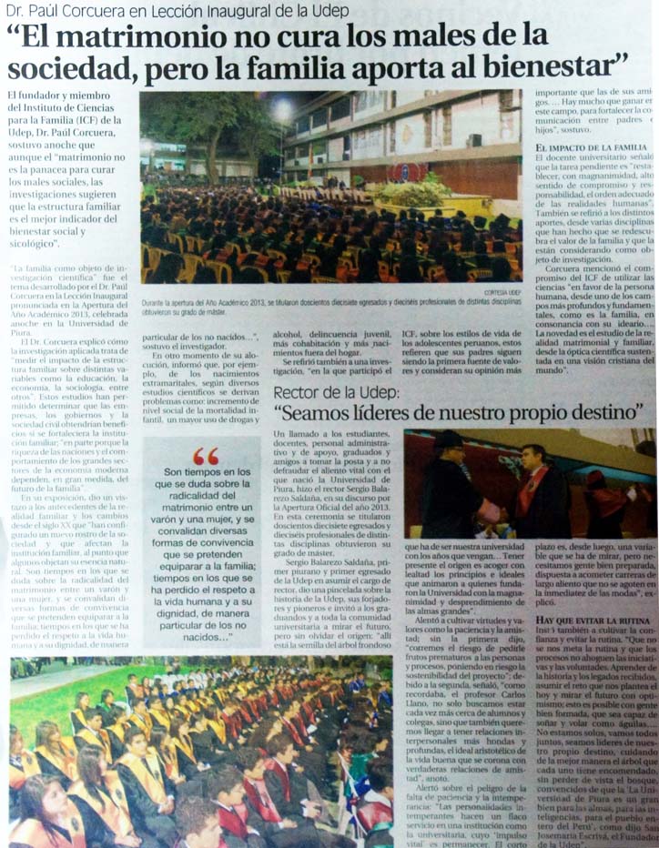 “La familia como objeto de investigación científica” fue el tema desarrollado por el Dr. Paúl Corcuera en la Lección inaugural pronunciada en la Apertura del Año Académico 2013, celebrada ayer en la Universidad de Piura. En ella, el fundador y miembro del Instituto de Ciencias para la Familia (ICF) de la UDEP, sostuvo que aunque el “matrimonio no es la panacea para curar los males sociales; las investigaciones sugieren que la estructura familiar es el mejor indicador del bienestar social y sicológico”.