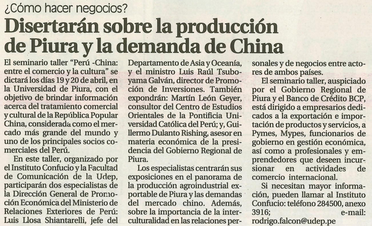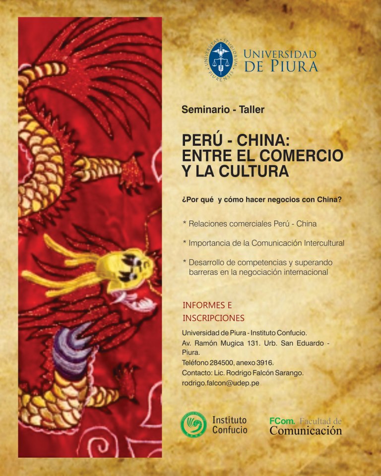 Por Melody Canales. 12 abril, 2013.Con el objetivo de brindar información acerca del tratamiento comercial y cultural de la República Popular China, considerada como el mercado más grande del mundo y uno de los principales socios comerciales del Perú, se dictará el Seminario taller “Perú – China: entre el comercio y la cultura”, el 19 y 20 de abril, en la Universidad de Piura.