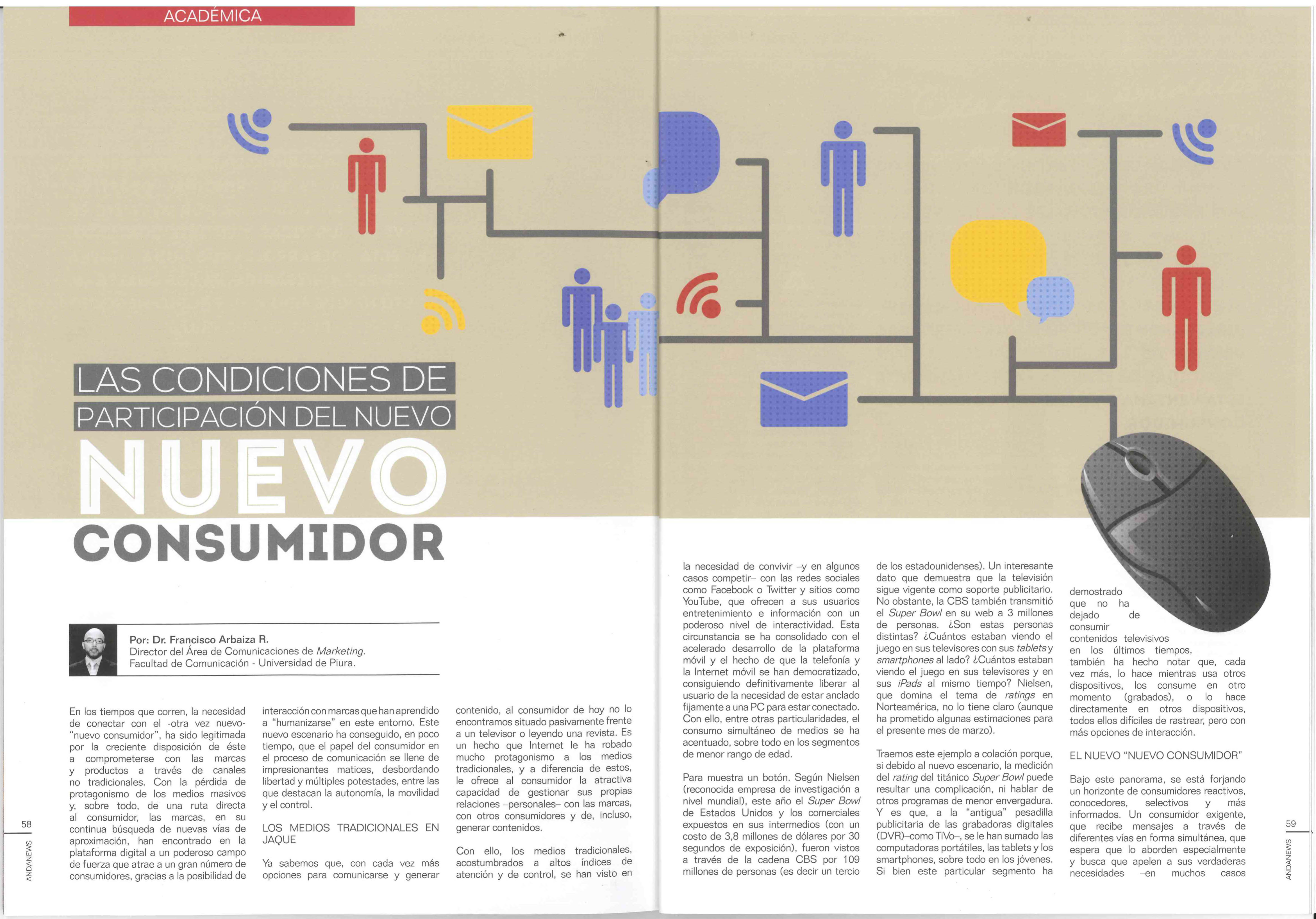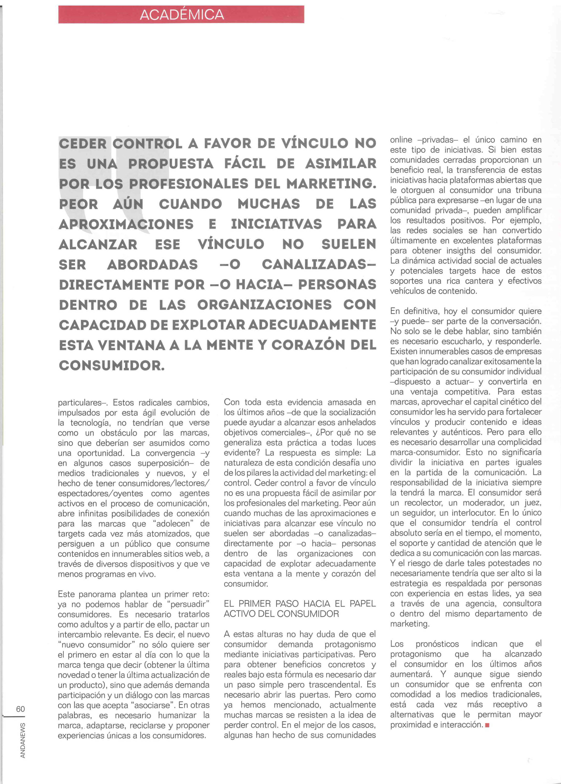 Por Francisco Arbaiza. 08 abril, 2013.En los tiempos que corren, la necesidad de conectar con el otra vez nuevo “nuevo consumidor”, ha sido legitimada por su creciente disposición a comprometerse con las marcas y productos a través de canales no tradicionales. Con la pérdida de protagonismo de los medios masivos y de una ruta directa al consumidor, las marcas, en su continua búsqueda de nuevas vías, han encontrado en la plataforma digital a un poderoso campo de fuerza que atrae a los consumidores. Esta vía ofrece gran potencial de interacción y le ha permitido a las marcas la posibilidad de “humanizarse”, pero sobre todo, ha conseguido, en poco tiempo, que el papel del consumidor en el proceso de comunicación se llene de impresionantes matices, desbordando libertad y múltiples potestades, entre las que destacan la autonomía, la movilidad y el control.