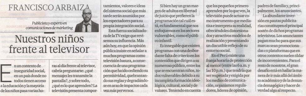 En el Perú existe una franja horaria de protección al menor –entre las seis de la mañana y las diez de la noche– que tendría que ser respetada y exigida por todos los agentes en juego: medios de comunicación, organismos reguladores, comunicadores, líderes de opinión, padres de familia y, principalmente, los anunciantes. Las abundantes inversiones en extensas pautas publicitarias constituyen el principal sostén de dichos programas televisivos. Los anunciantes pagan –y mucho– para que sus marcas sean promocionadas en plataformas que en otros contextos suelen tildar de “inconvenientes”. Para el resto de nosotros, gran desafío está en hallar la manera de ir más allá del marco académico y de la denuncia demagógica y hacer de verdad algo al respecto.