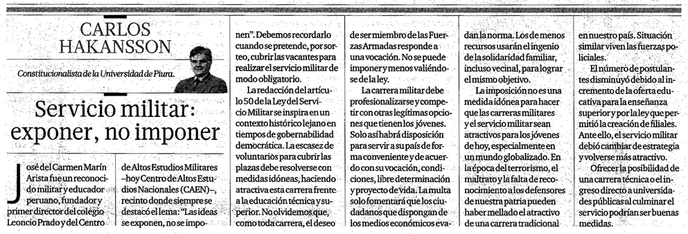 Por Carlos Hakansson. 15 abril, 2013.José del Carmen Marín Arista fue un destacado militar y educador peruano, fundador y primer director de la Colegio Leoncio Prado y del Centro de Altos Estudios Militares (hoy Centro de Altos Estudios Nacionales, CAEN), recinto en el que siempre se destacó la frase: “las ideas se exponen no se imponen”. Debemos recordarla cuando se pretende, mediante un sorteo, cubrir las vacantes para realizar el servicio militar de modo obligatorio.