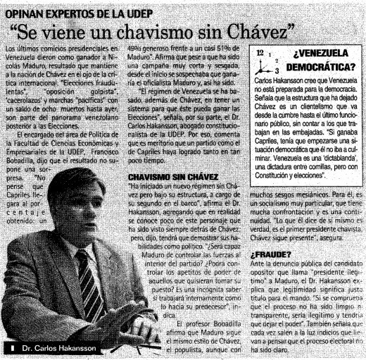 Ante la denuncia pública del candidato opositor que llama “presidente ilegítimo” a Maduro, el Dr. Hakansson explica que legitimidad significa justo título para el mando. “Si se comprueba que el proceso no ha sido limpio ni transparente, sería ilegítimo y tendría que dejar el poder”. También señala que cada vez salen a la luz indicios que llevan a pensar que el proceso electoral no ha sido claro.