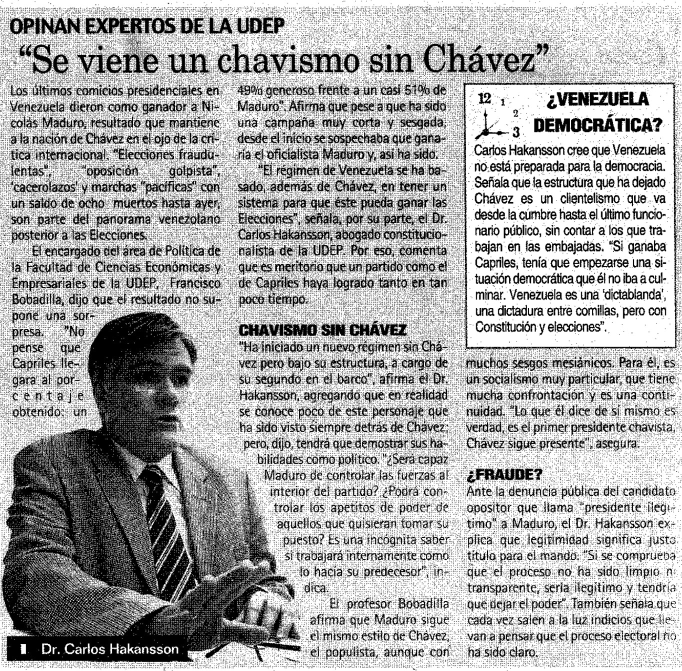“Ha iniciado un nuevo régimen sin Chávez pero bajo su estructura, a cargo de su segundo en el barco”, afirma el Dr. Hakansson quien comenta, además, que en realidad se conoce poco de este personaje que ha sido visto siempre detrás de Chávez; pero, dijo, tendrá que demostrar sus habilidades como político. “¿Será capaz Maduro de controlar las fuerzas al interior del partido? ¿Podrá controlar los apetitos de poder de aquellos que quisieran tomar su puesto? Es una incógnita saber si trabajará internamente como lo hacía su predecesor”, indica.