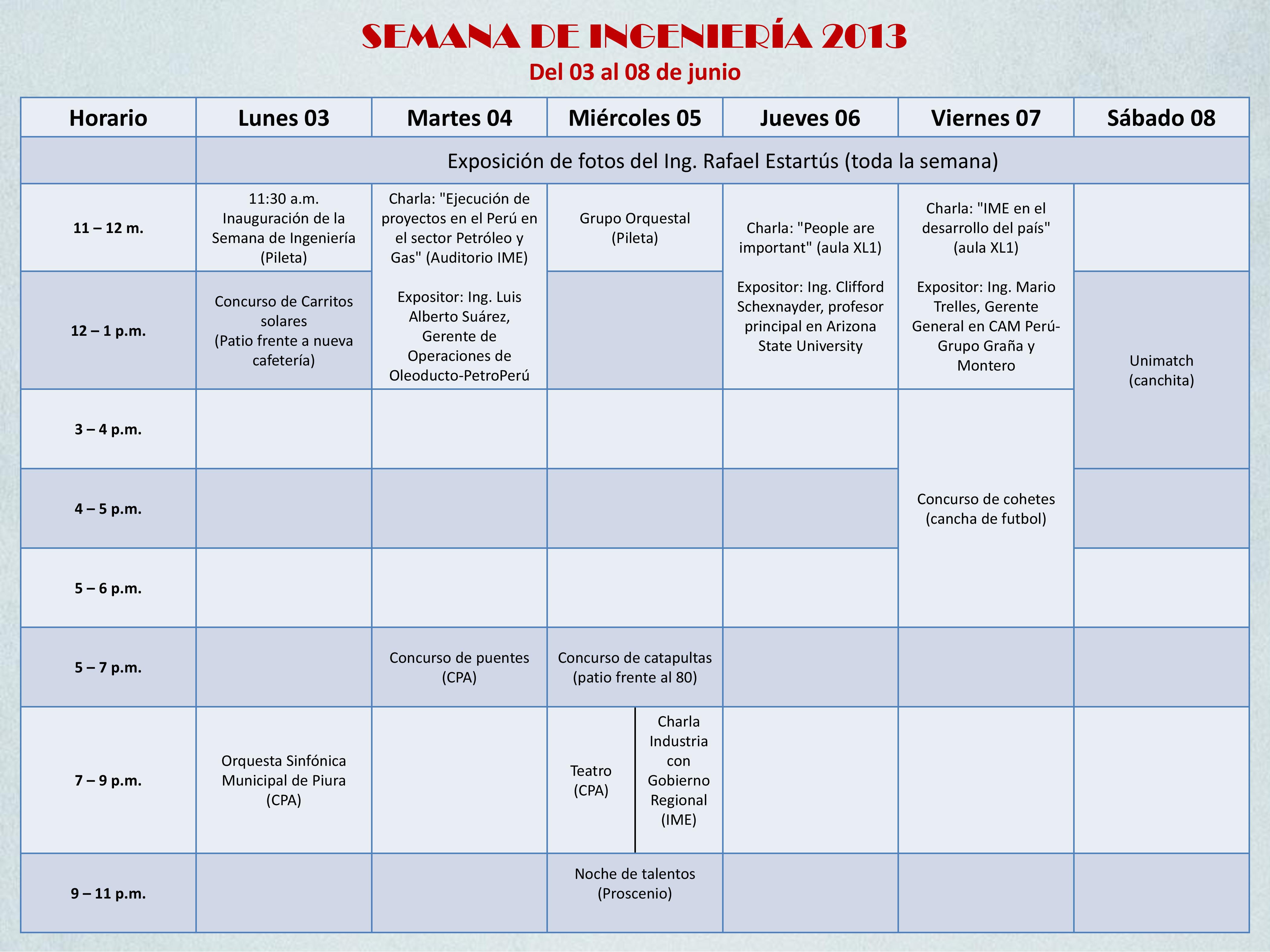 Por Javier Paico. 28 mayo, 2013.Del 03 al 08 de junio, la Universidad de Piura realizará una serie de actividades para conmemorar el día de la Ingeniería en el Perú, importante actividad profesional y de desarrollo para el país. Durante dicha semana, tendrán lugar diversas conferencias, concursos y actividades culturales.