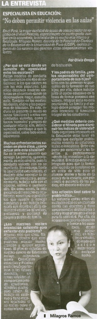 ¿Qué medidas debería considerar el Minedu para disminuir los índices de violencia?Todo organismo interesado en la Educación debe tener en cuenta que cualquier problemática necesita de soluciones reales e inmediatas. Se debe empezar por concientizar a las familias y, posteriormente –desde las escuelas– a la comunidad. El trabajo debe estar integrado para que la formación recibida se transforme en un estilo de vida para el alumno: dentro y fuera de la casa y de la escuela; con presencia o ausencia de los padres, del docente o director. Para ello, los perfiles de estos deben transmitir verdadera autoridad al estudiante y a la comunidad. El Estado debe resguardar la auténtica labor y autoridad de los progenitores y profesores.