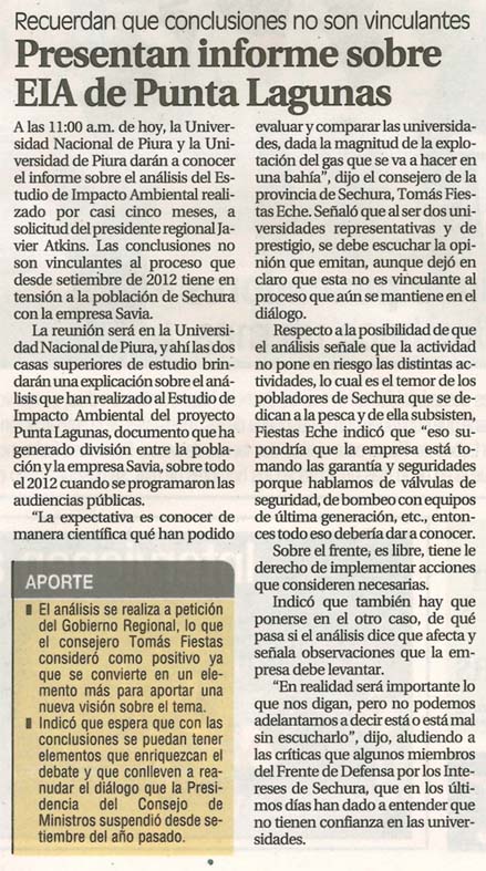 La Universidad Nacional de Piura y la Universidad de Piura darán a conocer el informe sobre el análisis del Estudio de Impacto Ambiental de Punta Lagunas, realizado a solicitud del presidente regional Javier Atkins.