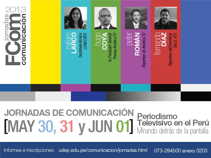 Como parte de sus actividades académicas, la Facultad de Comunicación de la Universidad de Piura, realizará este 30, 31 de mayo y 1 de junio, la XVI edición de las ‘Jornadas de Comunicación’. El tema que se desarrollará este año es ‘Periodismo Televisivo en el Perú: Mirando detrás de la pantalla’.