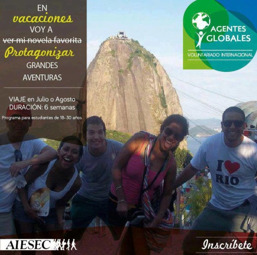 Por Claudia Reto. 06 junio, 2013.AIESEC, organización dirigida por jóvenes universitarios y recién graduados de todo el mundo, invita a todos los estudiantes y graduados de la Universidad de Piura a participar de un intercambio de seis semanas en Brasil. “AIESEC está presente en 113 países elegibles en cualquier época del año. Sin embargo, creo que Brasil es una muy buena opción para vivir una experiencia completamente diferente y renovadora en las vacaciones de mitad de año”, señaló Valeria Tarrillo, directora del Área de Comunicaciones de AIESEC de la UDEP campus Lima.