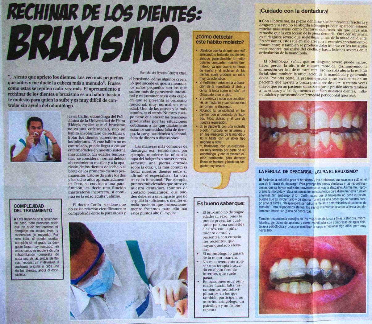 El Dr. Javier Carlín, odontólogo del Policlínico de la Universidad de Piura (UDEP), explica que el bruxismo no es una enfermedad sino un hábito involuntario de rechinar o frotar los dientes superiores con los inferiores. “Si este hábito no es controlado, puede llegar a causar enfermedades en nuestro sistema masticatorio. En edades tempranas, se considera normal debido al crecimiento maxilar y a la aparición de los dientes de leche o al brote de los primeros dientes permanentes. Esto se da entre los 2 y los 8 años aproximadamente. Pero, se considera una parafunción, es decir una función masticatoria incorrecta, si continúa en la edad adulta”.