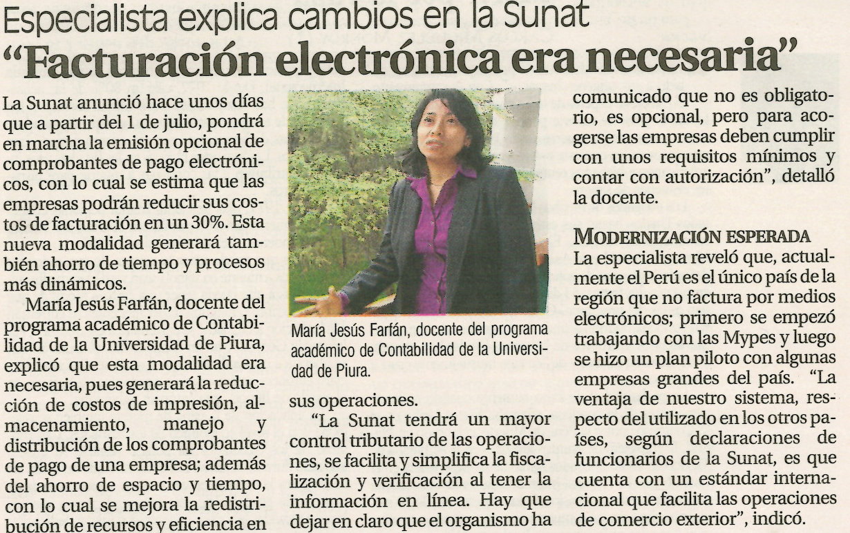 María Jesús Farfán, docente del programa académico de Contabilidad de la Universidad de Piura, explicó que esta modalidad era necesaria pues generará la reducción de costos de impresión, almacenamiento, manejo y distribución de los comprobantes de pago de una empresa; además del ahorro de espacio y tiempo, con lo cual se mejora la redistribución de recursos y mayor eficiencia en sus operaciones.
