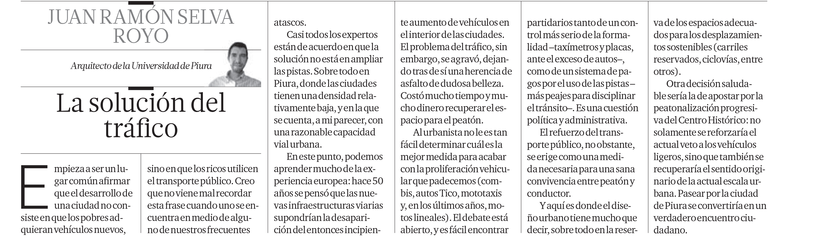 Casi todos los expertos están de acuerdo en que la solución no está en ampliar las pistas. Sobre todo en Piura, donde las ciudades tiene una densidad relativamente baja, y en la que se cuenta -según mi parecer- con una razonable capacidad vial urbana.