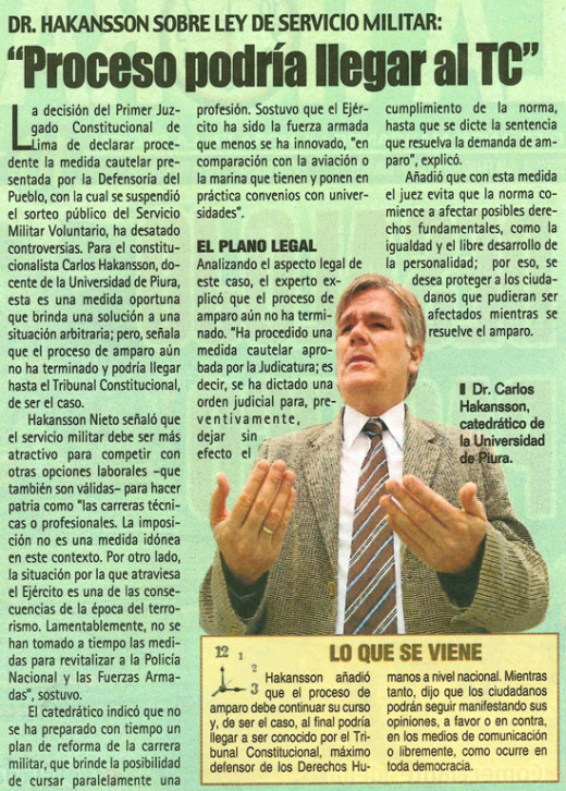La decisión del Primer Juzgado Constitucional de Lima de declarar procedente la medida cautelar presentada por la Defensoría del Pueblo, con la cual se suspendió el sorteo público del Servicio Militar Voluntario, ha desatado controversias. Para el constitucionalista, Carlos Hakansson, docente de la Universidad de Piura, esta es una medida oportuna que brinda una solución a una situación arbitraria; pero, señala que el proceso de amparo aún no ha terminado y podría llegar hasta el Tribunal Constitucional, de ser el caso .