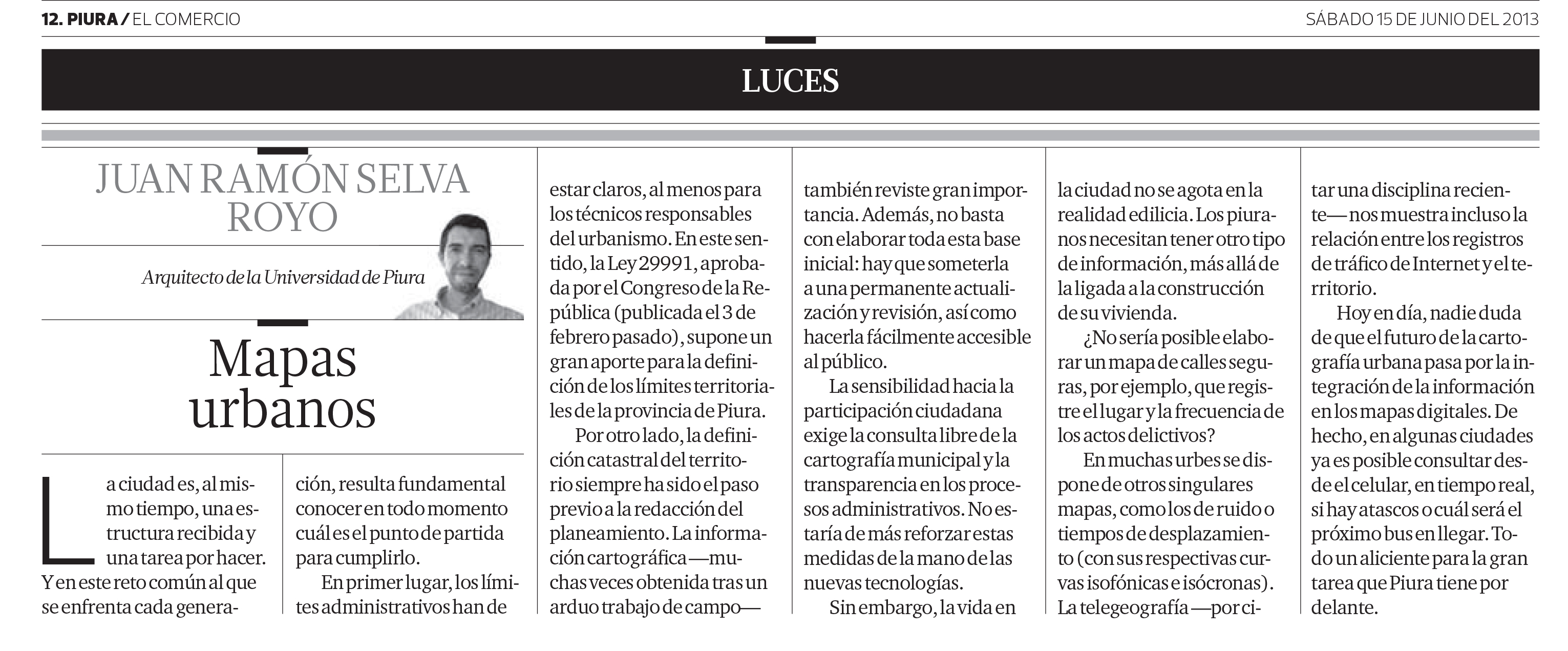 Hoy en día nadie duda de que el futuro de la cartografía urbana pasa por la integración de la información en los mapas digitales. De hecho, en algunas ciudades ya es posible consultar desde el celular, en tiempo real, si hay atascos o cuál será el próximo bus en llegar. Todo un aliciente para la gran tarea que Piura tiene por delante.