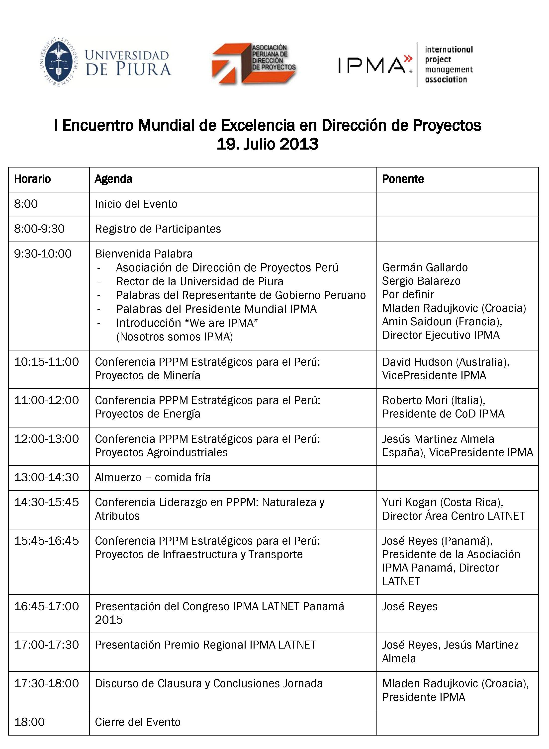 Por Javier Paico. 18 junio, 2013.La International Project Management Association (IPMA), en coordinación con la Asociación Peruana de Proyectos (APDP) y la Universidad de Piura (UDEP) organizan el “I Encuentro Mundial de Excelencia en Dirección de Proyectos”, que se realizará el 19 de julio, de 9 a.m. a 6 p.m., en el Campus Lima de la UDEP.