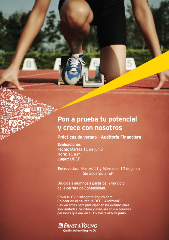 La evaluaciones del día Martes 11 de junio se realizarán en el aula 114 y entrevistas del día Miércoles 12 en las oficinas 308-B y 309-B del Programa Académico de Contabilidad y Auditoría. Envía tu Cv a integrate@pe.ey.com hasta el 06 de junio. Colocar en asunto “UDEP-Auditoria”
