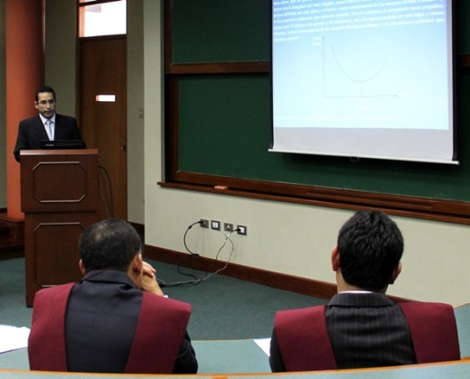 Durante su exposición, el tesista explicó que en una central generadora de energía eléctrica, la fuente de energía, ya sea el agua almacenada en una represa, el combustible, el viento, etc., hace girar las turbinas que impulsan los generadores eléctricos. La electricidad generada se transporta a una estación de transmisión donde un transformador convierte la corriente de baja tensión en alta. La electricidad es transportada por cables de alta tensión a los puntos de distribución, donde se reduce con transformadores hasta niveles adecuados para los usuarios.