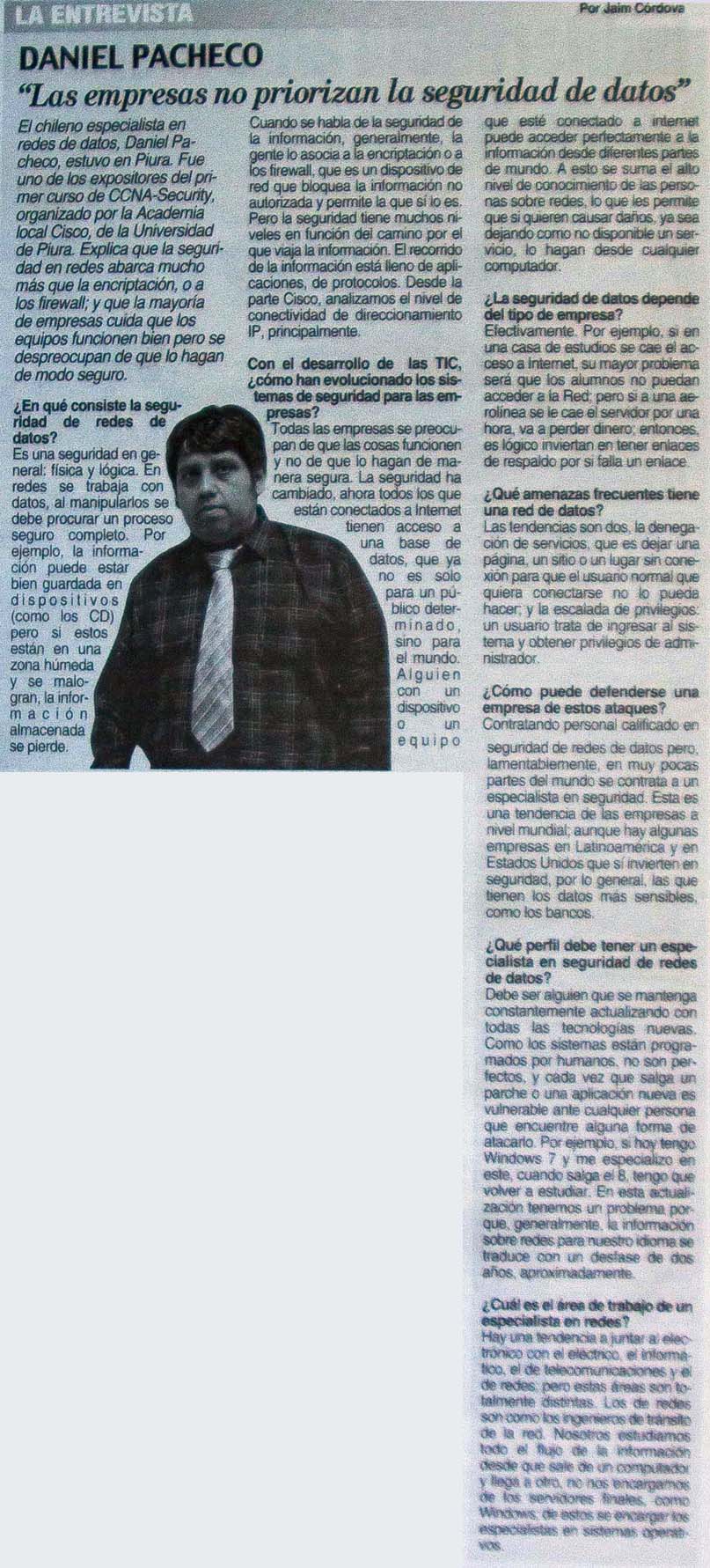 Por Jaim Córdova. 26 julio, 2013.El profesor del INACAP-Chile, Daniel Pacheco, estuvo en la Universidad de Piura durante el primer curso de CCNA-Securty, organizado por la Academia local Cisco, de la UDEP. Durante su exposición, Pacheco explicó que la seguridad en redes abarca mucho más que la encriptación, o a los firewall; y que la mayoría de empresas cuida que los equipos funcionen bien pero se despreocupan de que lo hagan de modo seguro.