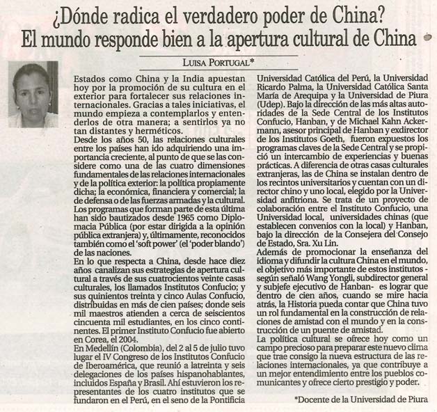 En Medellín (Colombia), del 2 al 5 de julio tuvo lugar el IV Congreso de los Institutos Confucio de Iberoamérica, que reunió a las 36 delegaciones de los países hispanohablantes, incluidos España y Brasil. Ahí estuvieron los representantes de los cuatro institutos que se fundaron en el Perú, en el seno de la Pontificia Universidad Católica del Perú, la Universidad Ricardo Palma, la Universidad Católica Santa María de Arequipa y la Universidad de Piura (UDEP). Bajo la dirección de las más altas autoridades de la Sede Central de los Institutos Confucio, Hanban, y de Michael Kahn Ackermann, asesor principal de Hanban y exdirector de los Institutos Goeth,  fueron expuestos los programas claves de la Sede Central y se propició un intercambio de experiencias y buenas prácticas
